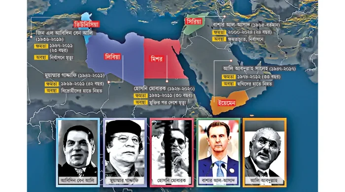 লিবিয়া: ১৯৬৯ সালে সামরিক অভ্যুত্থানে রাজতন্ত্র উৎখাত করে ক্ষমতায় আসেন গাদ্দাফি। তেলসম্পদের ওপর ভর করে ব্যক্তিকেন্দ্রিক শাসন ব্যবস্থা গড়ে তোলেন তিনি। ২০১১ সালের ফেব্রুয়ারিতে বেনগাজিতে মানবাধিকারকর্মী গ্রেপ্তারের প্রতিবাদে আন্দোলন শুরু হয়, যা দ্রুত গৃহযুদ্ধে রূপ নেয়।